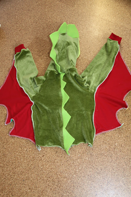Den Kapuzenpullischnitt aus der Ottobre 4/2009 in Größe 104 aus grünem Nicki zuschneiden, das Rückenteil einfach mittig durchschneiden, aus stärkerem Filz Zacken schneiden und einfach zwischen Kapuzennaht und Rückennaht einnähen (durch die stärke des Filzes stehen sie von alleine), aus Jersey (wie innen in der Kapuze) einen Körper ausschneiden, mit Vlieseline verstärken, einfachen Geradstich draunähen und an das Vorderteil annähen, aus Wolkennicki und Jersey Flügel ausschneiden (nach eigenem gezeichnetem Muster) und zusammennähen, die Ärmel an das Vorder und Rückenteil annähen, die Flügel an den Ärmel und dem Vorderteil annähen (rechts auf rechts), das Rückenteil annähen (die Nähte sind außen, sieht super aus) bzw. die Ärmel schließen, die Kapuze füttern und an das Oberteil annähen, Bündchen an die Ärmelabschlüsse und den unteren Saum etwas im Bogen schneiden und einfach mit der Ovi umsäumen, den Schwanz annähen (zeig ich euch noch).